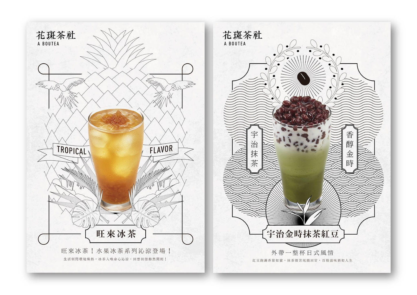 The team of A BOUTEA had searched the top quality of tea leaves in Nantou, Taiwan and been trained by Taiwanese tea master to brew and blend a cup of great tea drink. After several meetings of brand brainstorming, OCTOSHIP and the client chose 'leopard' as a main brand image in order to correspond with the flagship product- 'brown sugar bubble series' (looks like spots on leopards), and furthermore we found a coincidence that the pronunciation between 'brew' tea and 'leopard' is really similar in local Cantonese dialect.